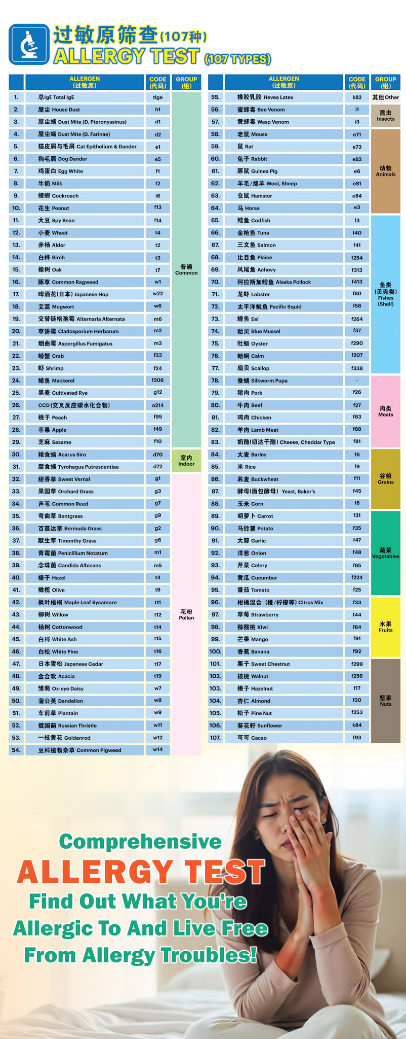 Designed for individuals with complex or persistent allergic symptoms. This test identifies 107 potential allergen triggers and offers a clear path to manage allergies and enhance quality of life. Full panel screening for 107 allergens, including food, pollen, spices, and environmental triggers. Suitable for complex or long-term allergy sufferers.