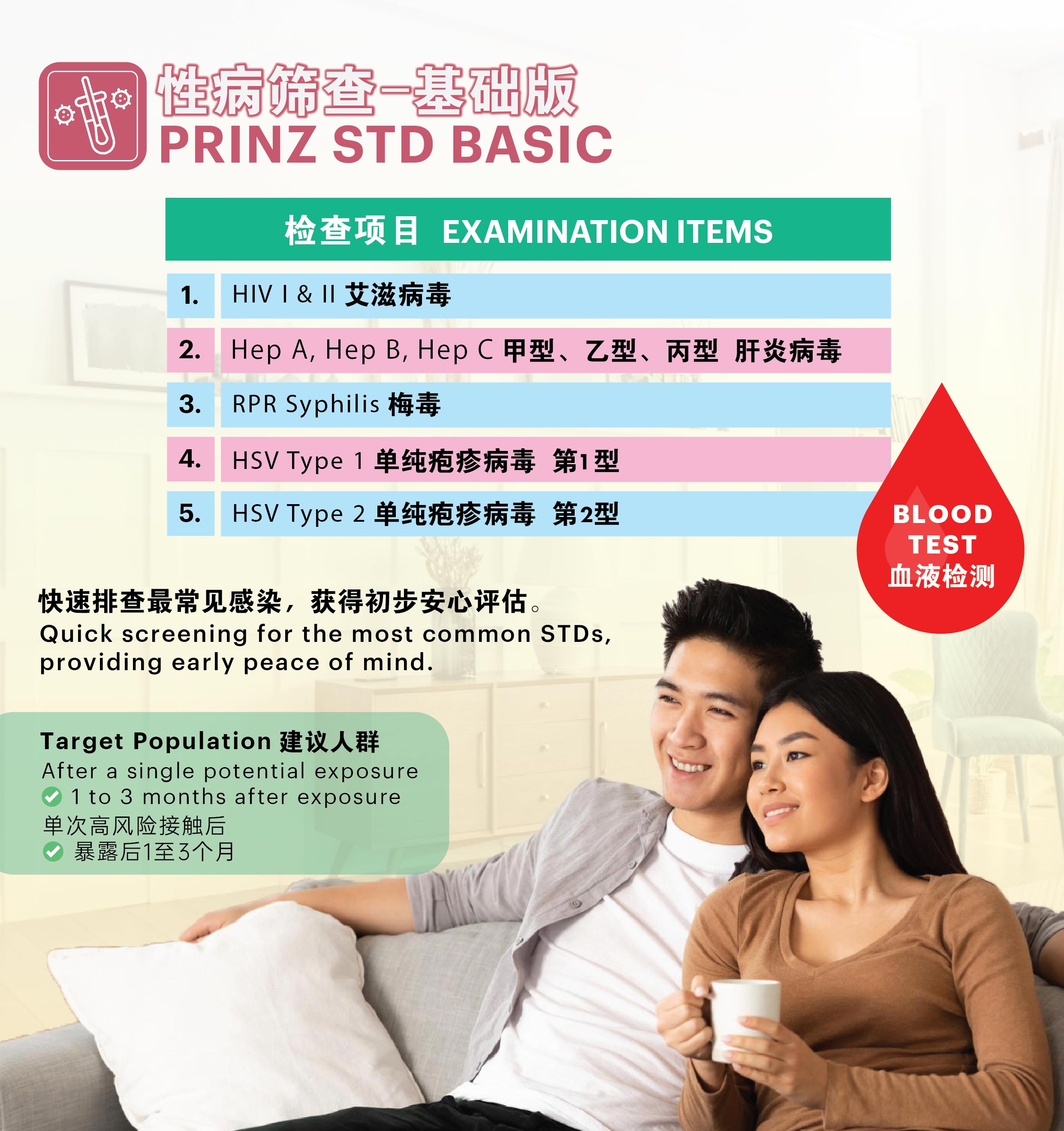 Prinz STD Basic Screening is a medically essential entry-level test designed to detect the most common sexually transmitted infections (STIs). This package focuses on viral and blood-borne infections, including HIV, Hepatitis A/B/C, Syphilis, and Herpes Simplex Virus (HSV-1 & HSV-2). All tests are performed through a blood sample, offering accurate early detection for individuals seeking a rapid assessment after potential exposure.