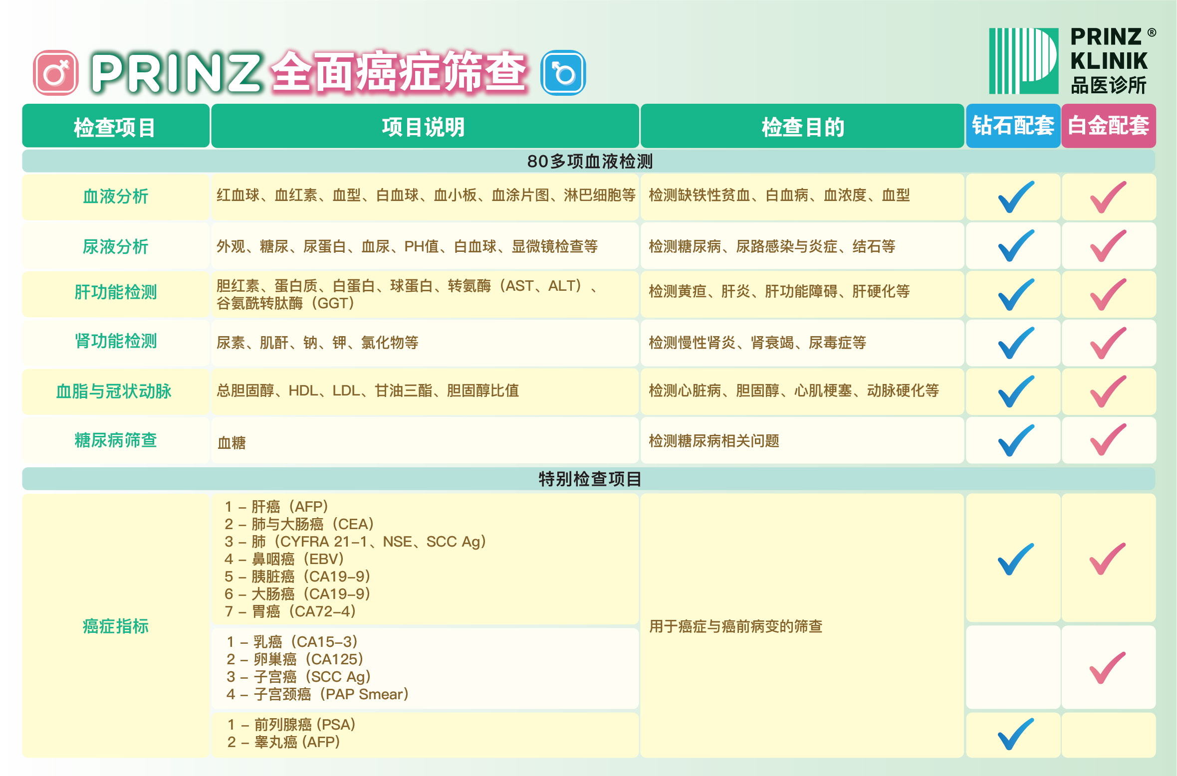 Prinz Klinik品医诊所的全面癌症筛查通过超过80项血液与尿液检测及多项肿瘤指标测试,评估身体各主要器官的健康状况与潜在癌症风险。此筛查可检测出体内异常抗原或蛋白质变化,用于早期发现肝癌、肺癌、结肠癌、胰腺癌、鼻咽癌、乳腺癌、卵巢癌、子宫癌及前列腺癌等。